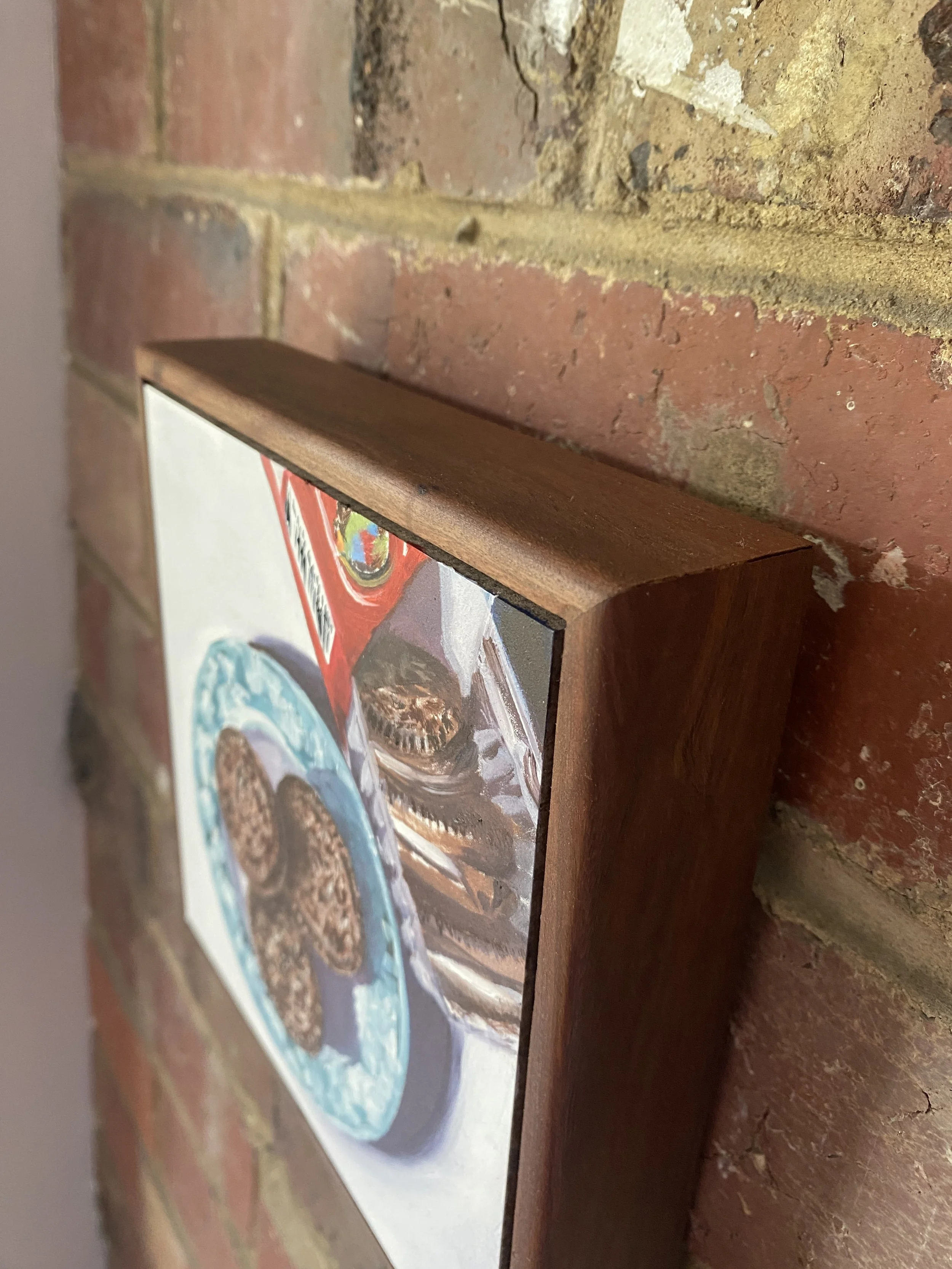Delta Creams - Sometimes a biscuit with a cup of tea is all you need to stop and have a nice little break or comma in the day. I love the detail in the top of these biscuits and the contrast of white cream between the dark chocolate. They were around way before oreos came to Australia and I think I like them better anyway. Framed in a custom gallery frame.