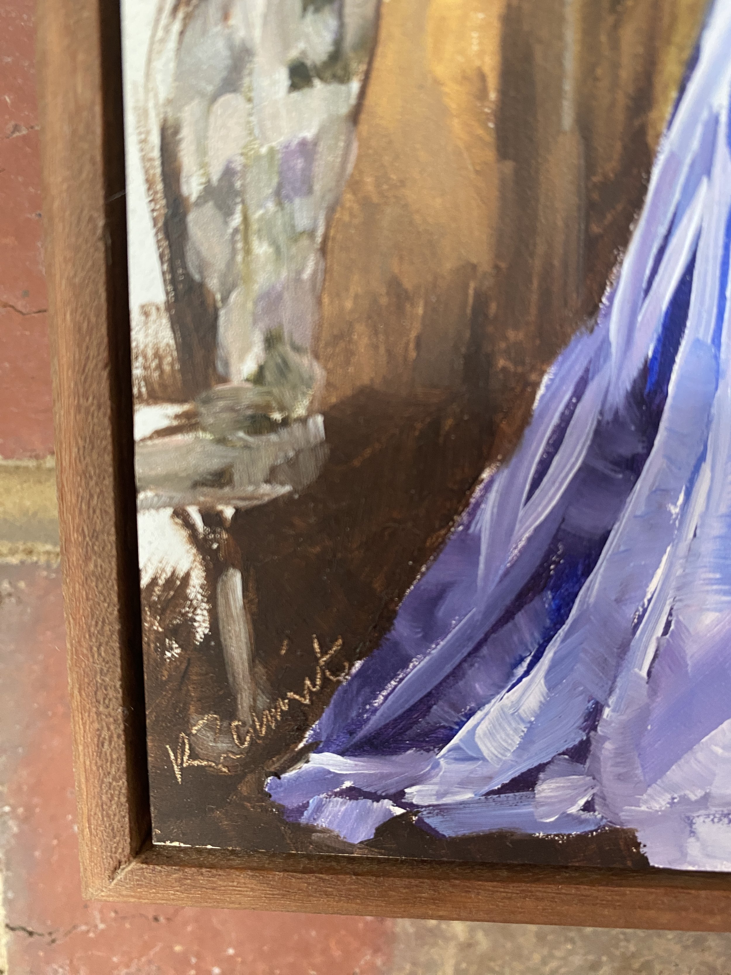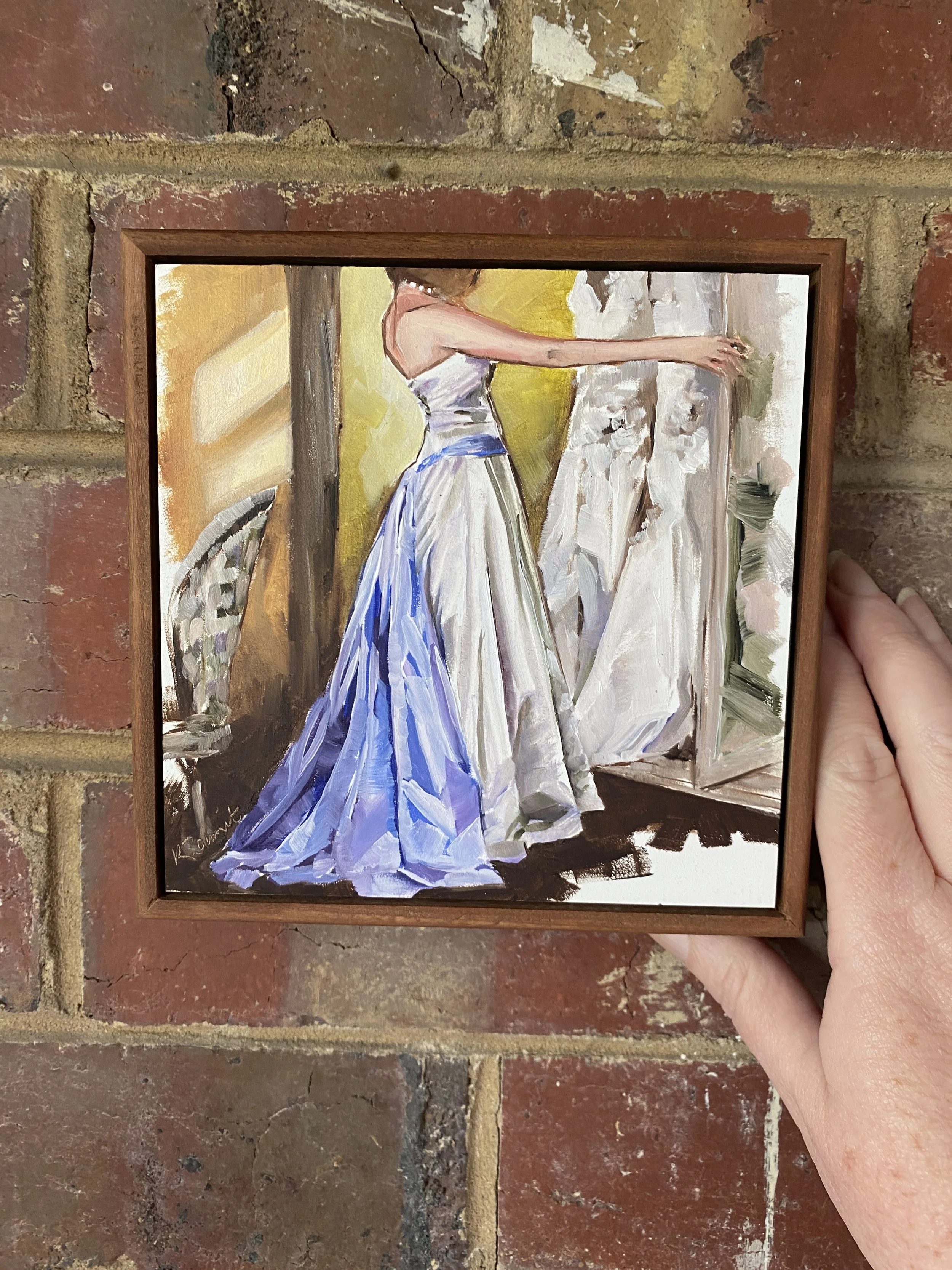 A study of choosing a dress and wanting it all to be perfect. I was drawn to the luscious white satin that I always admire in an old master’s painting and enjoyed the composition. The blue satin sash that drapes down the back of the dress caught my eye too. It was fun to paint this one. Framed in a custom gallery frame, this piece would be perfect for a wall in a walk in robe or on a cabinet in the bedroom
